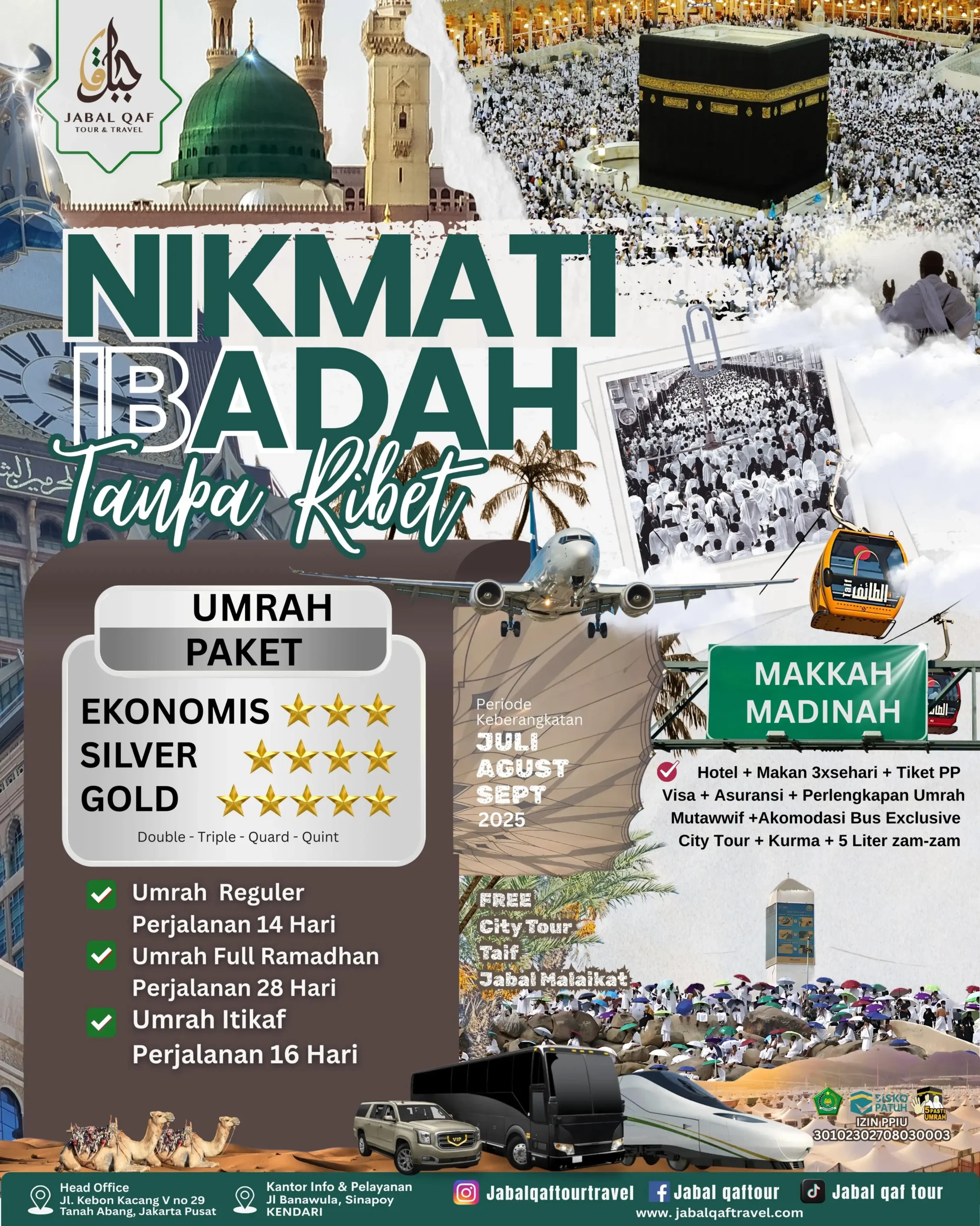 Kami menawarkan berbagai Paket perjalanan Haji khusus dan Umroh + Tour Asia atau Eropa kepada Anda dengan penawaran harga yang sesuai fasilitas dengan harga wajar.